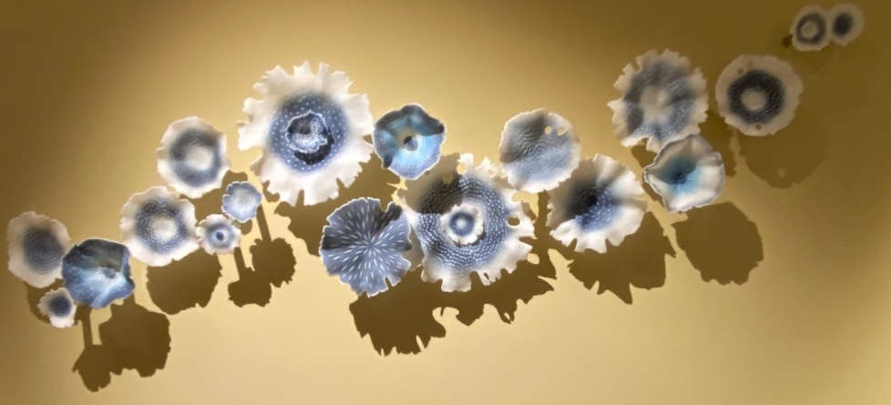 F,R. Maher knew immediately what piece to choose. It was 'Glimmers in Blue' by the talented glass artist, Verity Pulford. Painstakingly created in layers of pate de verre, intricately coloured and delicately sandblasted, it is an arresting piece of art. But what are those things? Organic, obviously. Are they flowers, coral or fungi? Imagining them propelling themselves lazily through the deep oceans, displaying a dazzling array of bioluminescence, F.R. Maher created a brief scene of such horror, it thrilled Emyr who demanded she had to write the rest of the play.